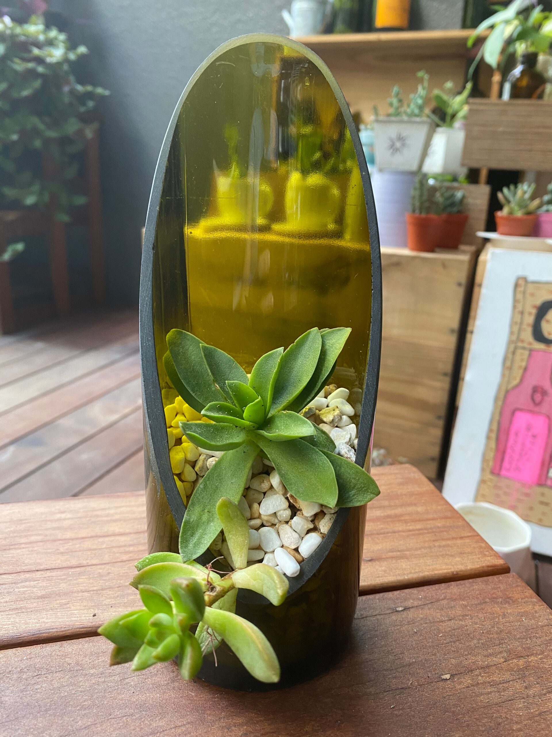 Please note that every product is unique as the wine bottles may be different and they are cut manually too. Plants are also customized to match each unique cut glass item.